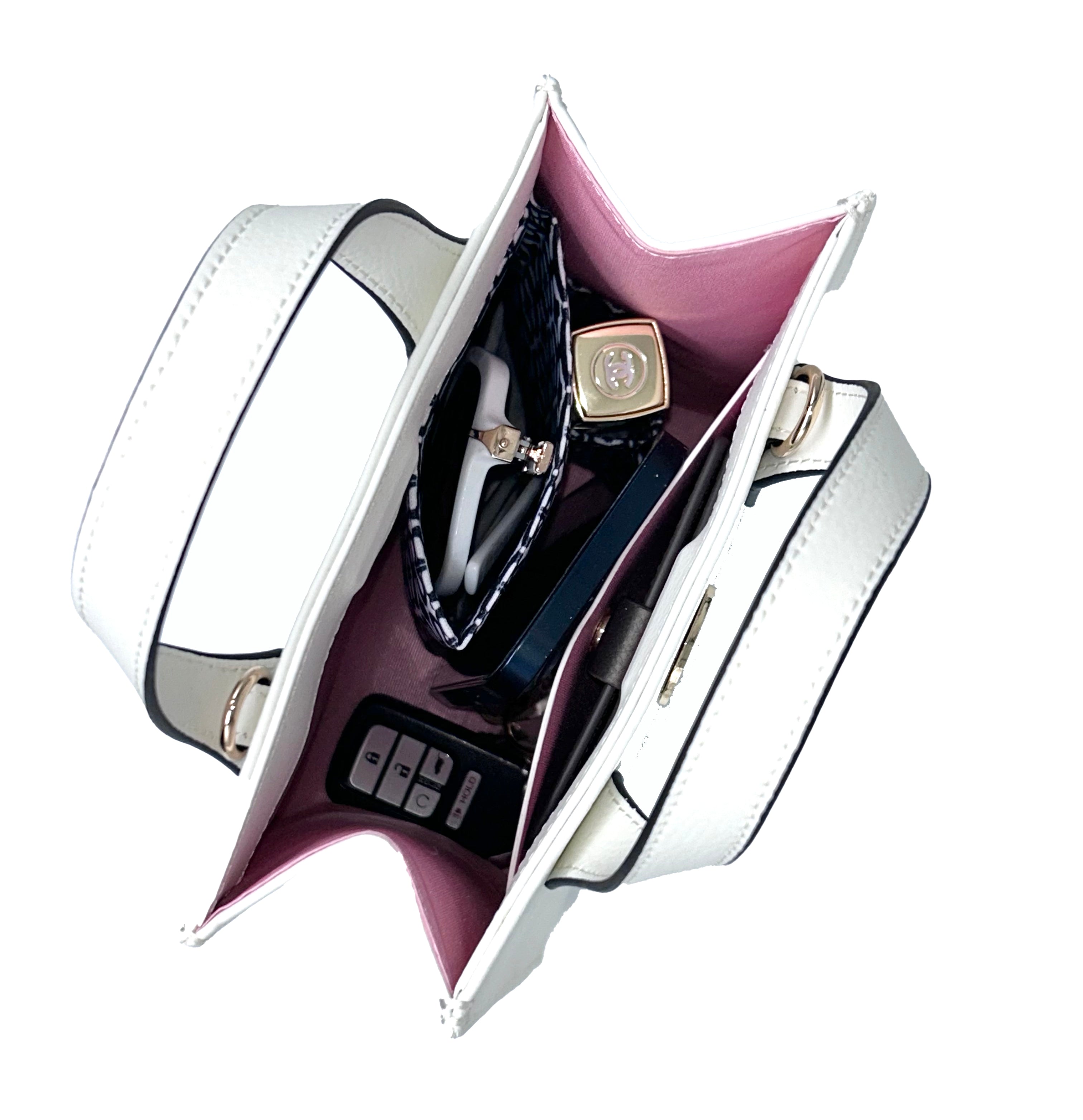 It is so hard to find great leather alternative bags and this one not only has this great material at a great price point but also is such a cute bag design! The glasses compartment is not necessary for me but I think it is a smart design addition and the top handles and long adjustable strap make it easy to wear this bag comfortably in versatile ways. I particularly love this white color as it looks so chic but is carefree!